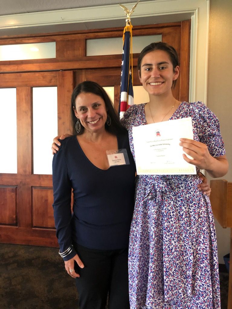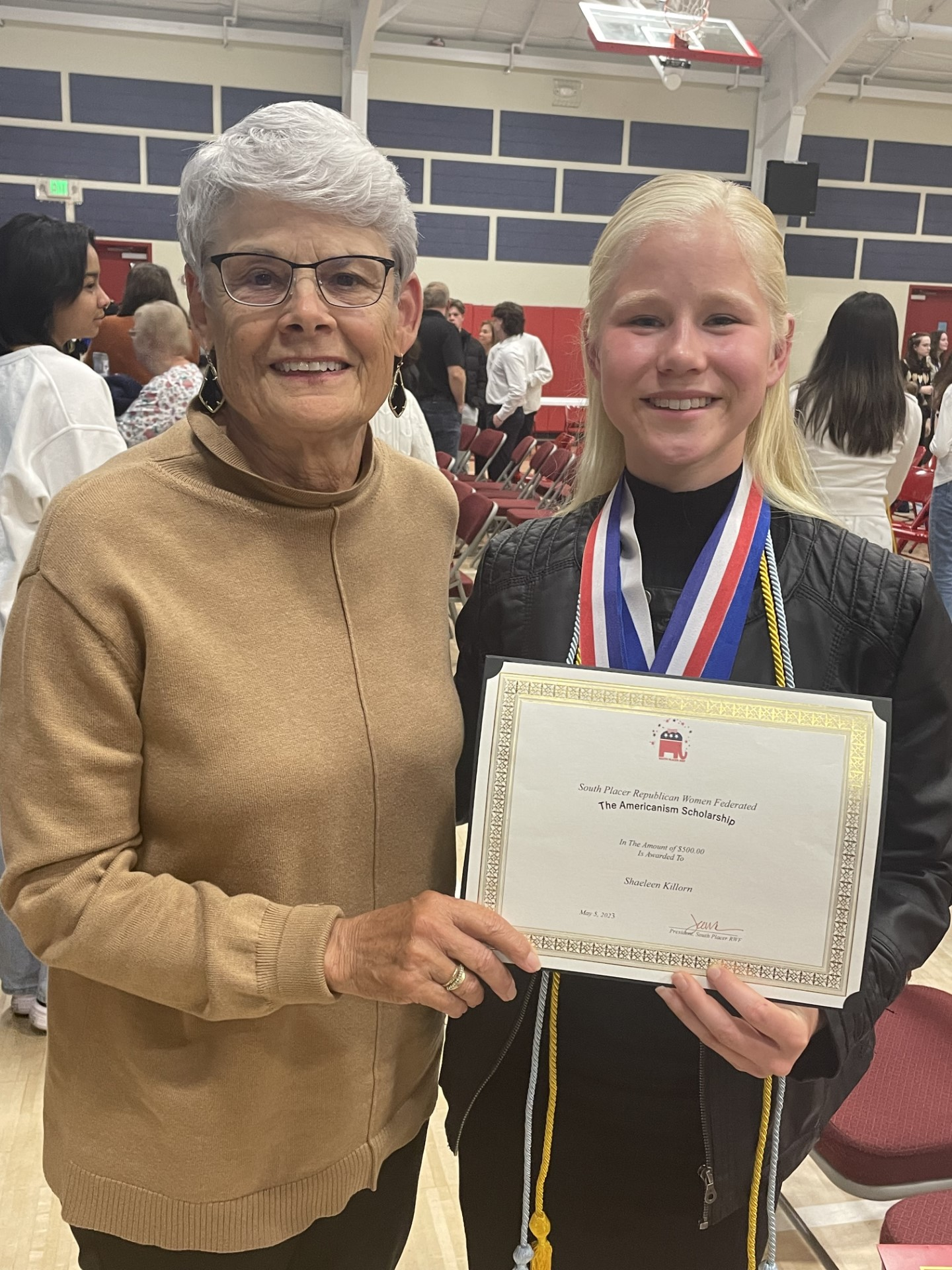 Lynn Kyme pictured with the winner o the 2023 Americanism Scholarship. Shaelee is attending Corban University!